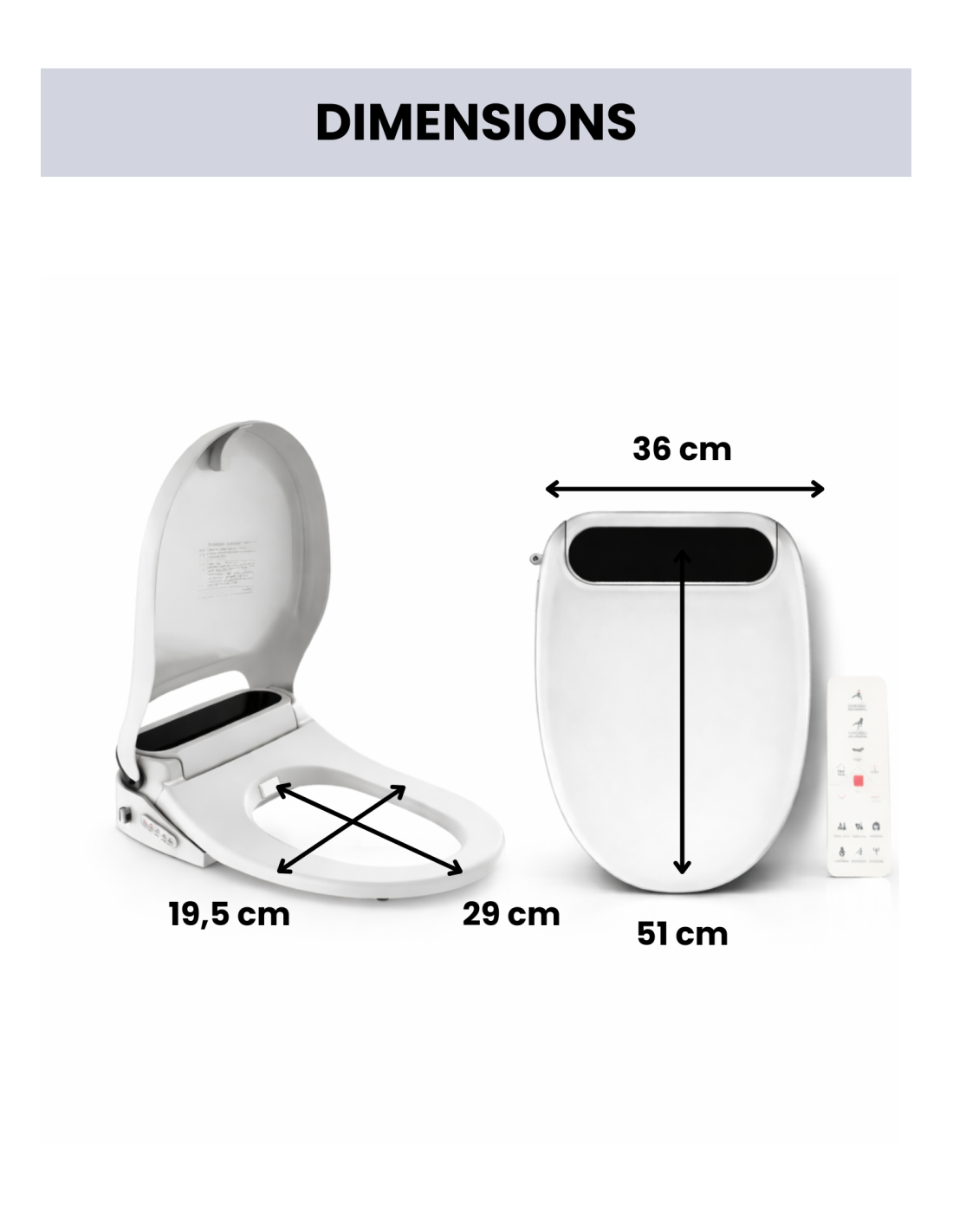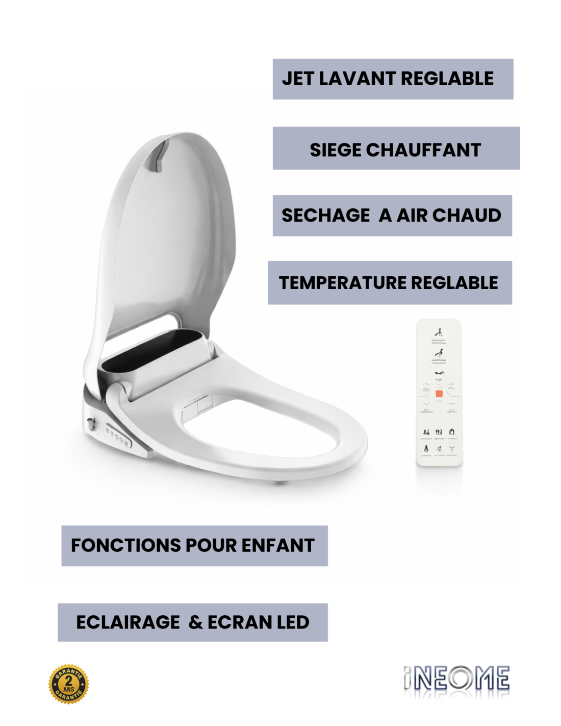 Confort, hygiène et technologie au quotidien avec lavage à l'eau, séchage, siège chauffant et réglage personnalisables. Installation facile et rapide, idéal pour WC standards