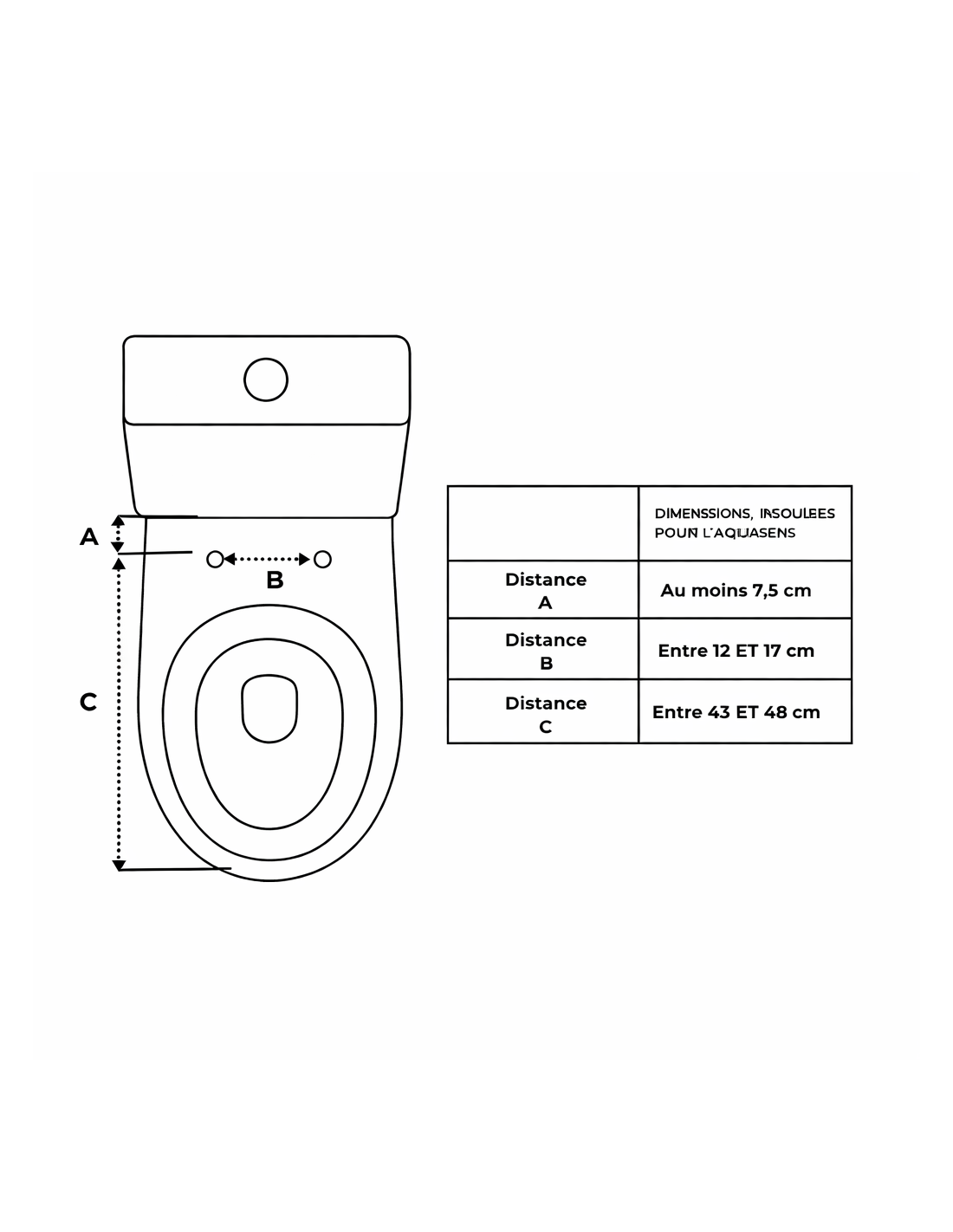 L’abattant WC AQUASENS s’installe sur la grande majorité des toilettes existantes. Il est recommandé de vérifier les dimensions avant installation. Un espace minimum de 7,5 cm est nécessaire entre l’axe des vis et le réservoir ou le mur. Le câble d’alimentation électrique se situe à droite et le flexible d’alimentation en eau à gauche. Une prise électrique est à prévoir.