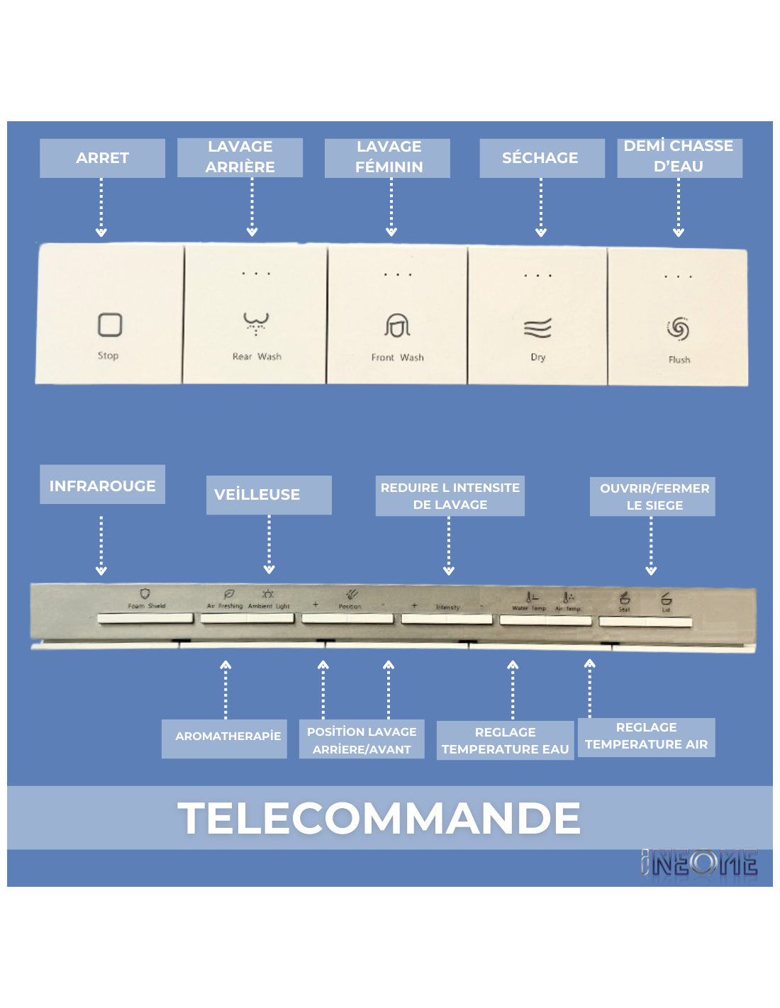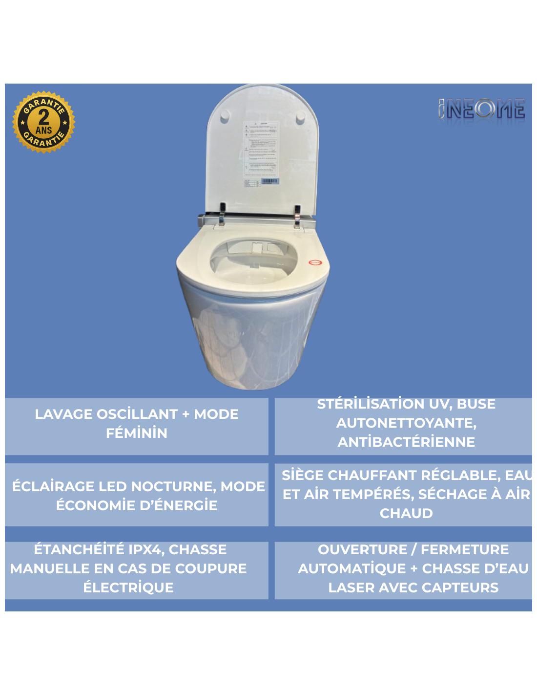 Découvrez le modèle NEOWASH de INEOME, un WC intelligent lavant au sol au design épuré et à la finition haut de gamme, pensé pour apporter une allure sophistiquée à votre salle de bain. Grâce à son lavage à l'eau, sa fonction de séchage, sa lunette chauffante, sa température réglable, il améliore le bien-être tout en réduisant l'usage de papier toilette.