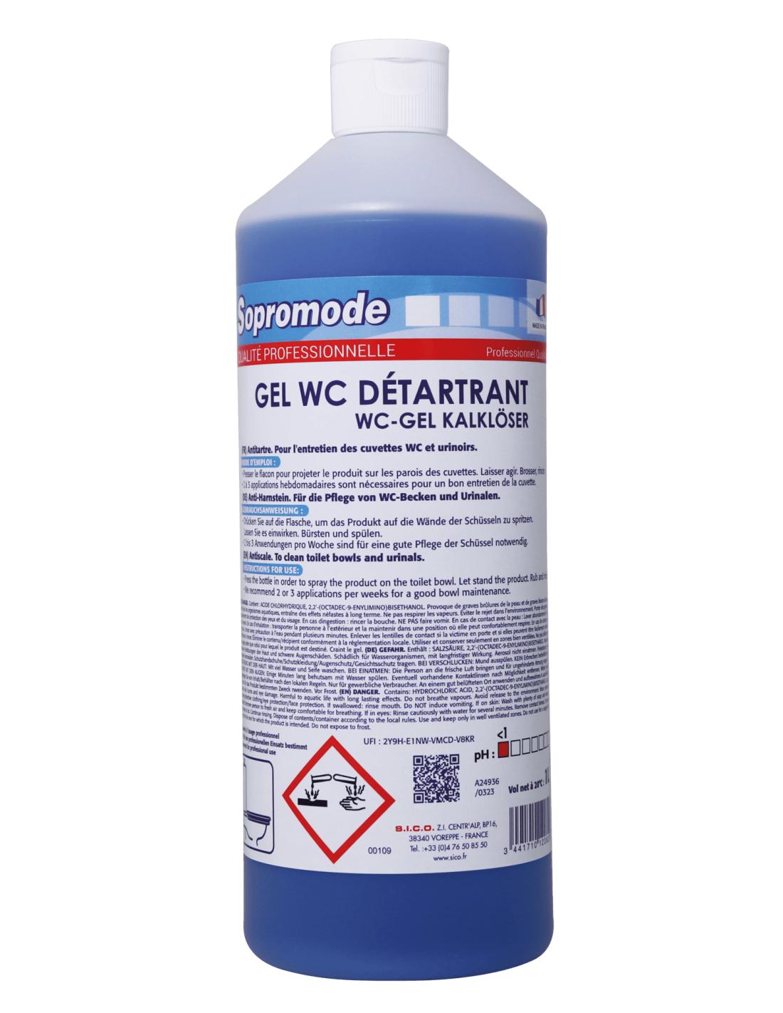 Le gel nettoie, détartre et ravive la brillance des installations sanitaires. Sa texture confÚre une bonne adhérence du produit sur les parois. Il s'utilise sur les cuvettes, urinoirs et pourtours des robinetteries