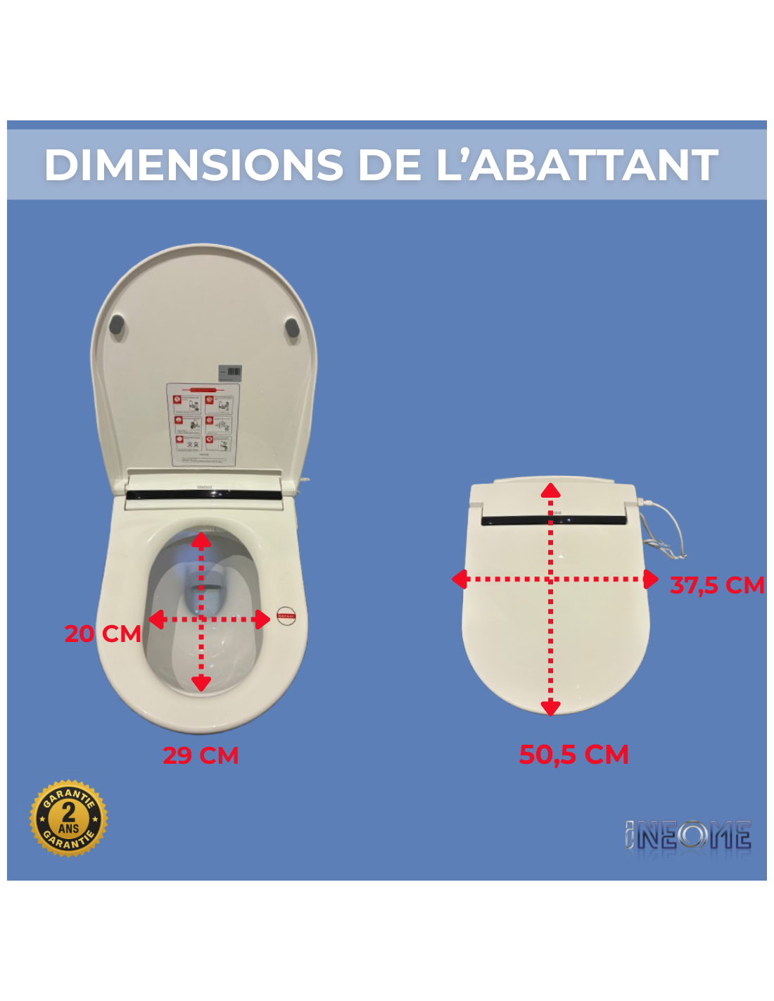 - Dimensions de l’abattant : 50,5 cm × 37,5 cm × 5 cm (L × l × H)