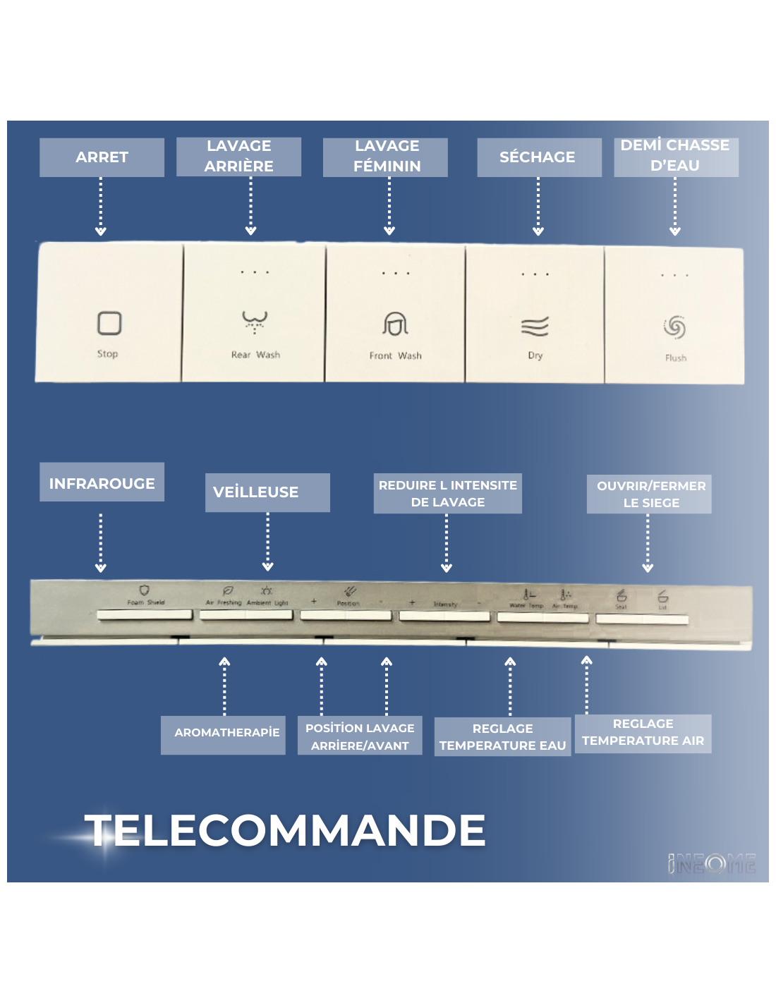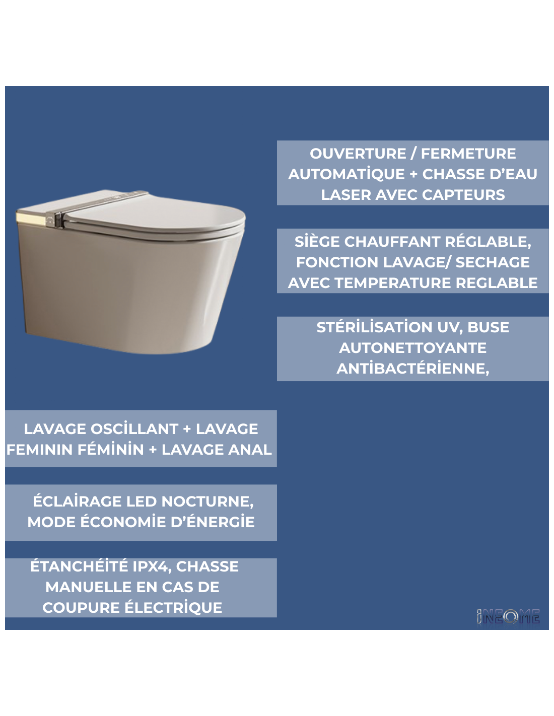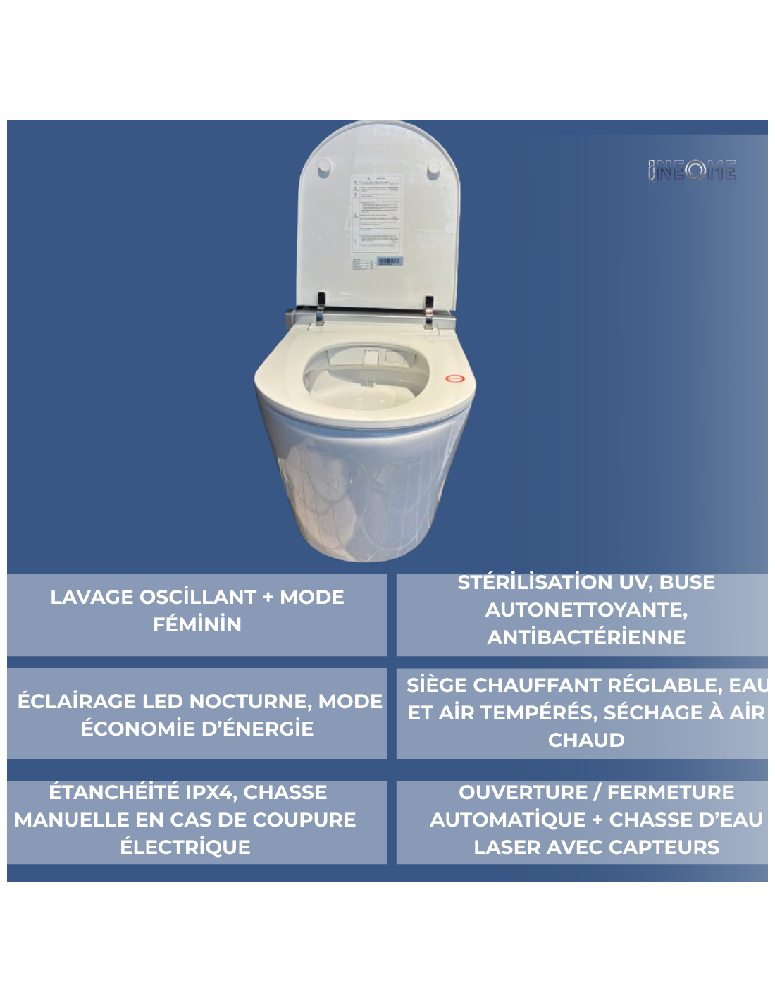 Équipé des technologies les plus avancées - stérilisation UV, lavage personnalisable, chauffage instantané, chasse automatique et télécommande sans fil - il redéfinit les standards du confort moderne et de l’hygiène haut de gamme.